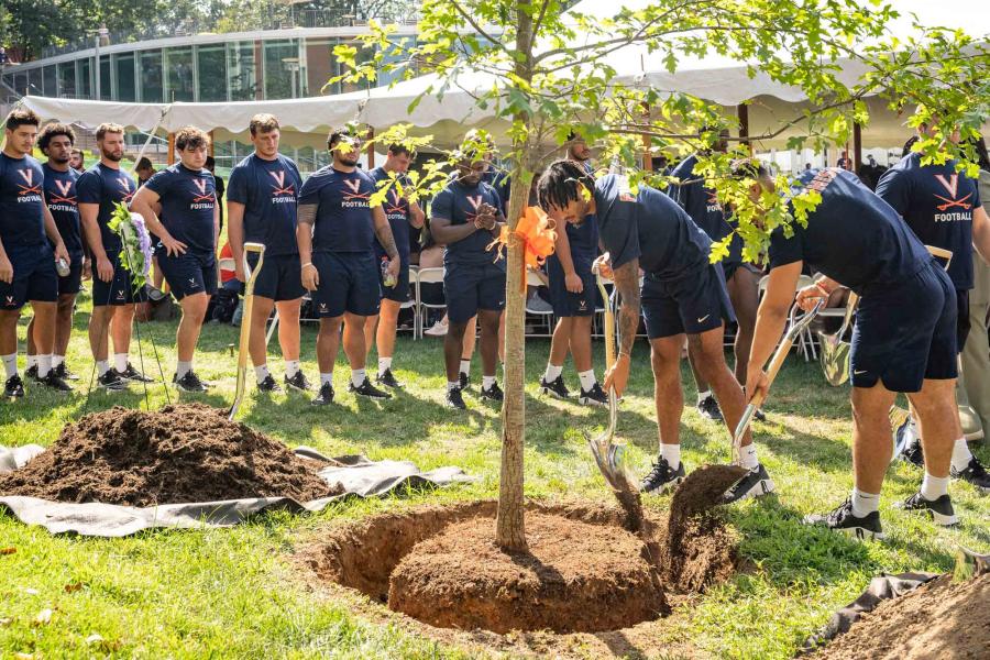 In near silence, students, staff, faculty and community members walked from the UVA Chapel down Rugby Road to the Betsy and John Casteen Arts Grounds, where they gathered near a memorial to the players and a tree planted in their honor.
